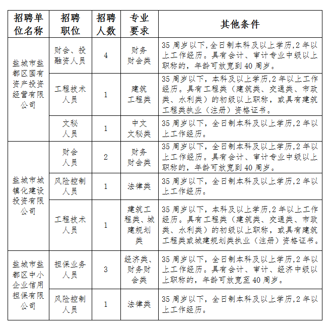 根據(jù)工作需要,鹽城市鹽都區(qū)財政局直屬國有企業(yè)鹽城市鹽都區(qū)國有資產(chǎn)投資經(jīng)營有限公司、鹽城市城鎮(zhèn)化建設(shè)投資有限公司、鹽城市鹽都區(qū)中小企業(yè)信用擔(dān)保有限公司決定面向社會公開招聘工作人員?,F(xiàn)將有關(guān)事項公告如下: