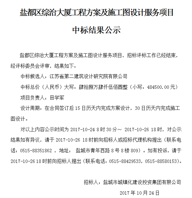 鹽都區(qū)綜治大廈工程方案及施工圖設(shè)計服務(wù)項目中標(biāo)結(jié)果公示