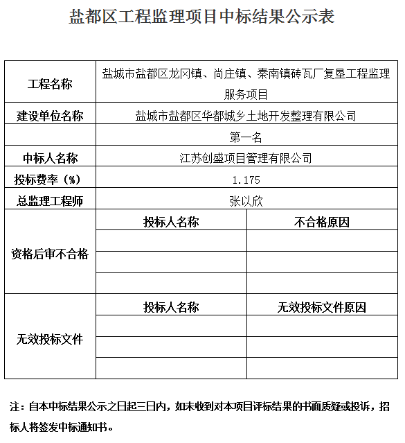 鹽城市鹽都區(qū)龍岡鎮(zhèn)、尚莊鎮(zhèn)、秦南鎮(zhèn)磚瓦廠復(fù)墾工程監(jiān)理服務(wù)項目中標(biāo)結(jié)果公示