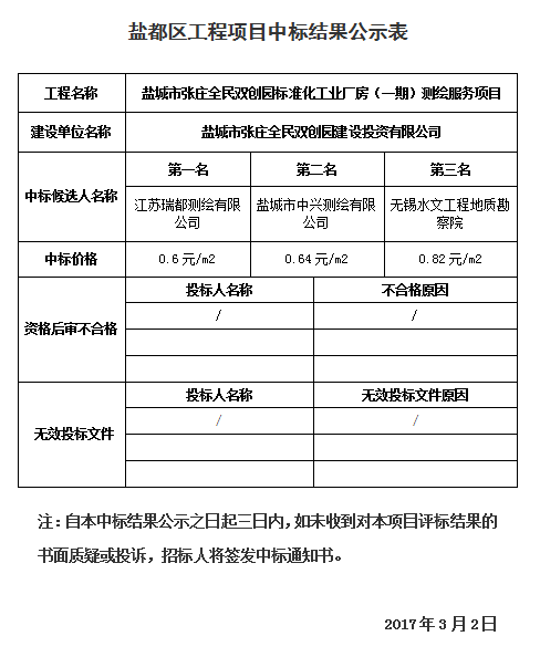 鹽城市張莊全民雙創(chuàng)園標準化工業(yè)廠房(一期)測繪服務(wù)項目中標公示