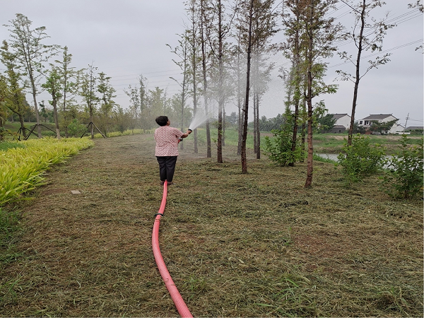 在晴熱少雨的日子,夏季植物生長(zhǎng)茂盛,各類雜草長(zhǎng)勢(shì)迅猛,清除雜草也是當(dāng)下綠地養(yǎng)護(hù)的一大任務(wù)。在天氣熱、任務(wù)重、困難多的情況下,綠化養(yǎng)護(hù)隊(duì)伍根據(jù)植物需求,堅(jiān)持科學(xué)管理、序時(shí)作業(yè)、精心維護(hù),有的在澆水除草,有的在松土施肥,有的在修枝剪葉……廊道兩岸一派忙碌的勞動(dòng)景象。在隊(duì)員們的精心呵護(hù)下,蟒蛇河水上文化生態(tài)廊道呈現(xiàn)一片欣欣向榮的綠色生機(jī)。