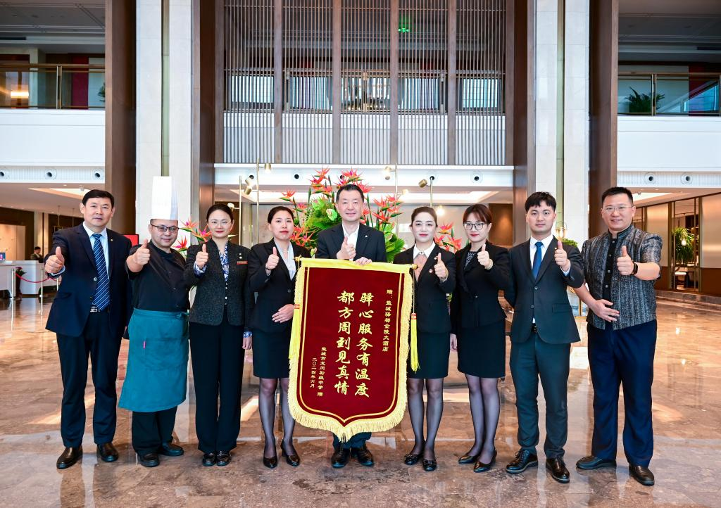 龍岡初級(jí)中學(xué)、鞍湖實(shí)驗(yàn)學(xué)校特地送來(lái)了一面繡著“驛心服務(wù)有溫度 都方周到見真情”的錦旗,表達(dá)對(duì)酒店服務(wù)的認(rèn)可與感激。酒店總經(jīng)理封光雄在接受錦旗時(shí)表示,“我們深感榮幸能夠成為學(xué)子們追夢(mèng)路上的助力者。這面錦旗不僅是對(duì)我們工作的認(rèn)可,更是激勵(lì)我們不斷前進(jìn)的動(dòng)力。我們將繼續(xù)秉承‘驛心服務(wù)’的理念,為每一位賓客提供更加周到的優(yōu)質(zhì)服務(wù)”。